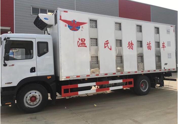 【豬苗車(chē)】上裝配置:外玻璃鋼,內(nèi)不銹鋼,兩層液壓升降層板,尾部液壓翻轉(zhuǎn)上豬平臺(tái),層板為不銹鋼骨架鋪鋁花紋板。外部電動(dòng)升降窗,排氣扇,柴油發(fā)電機(jī),暖風(fēng)加熱,喂水系統(tǒng),凈水箱、污水