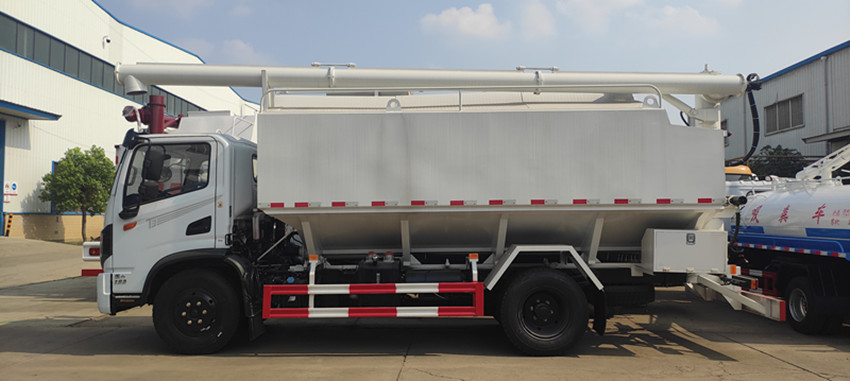 散裝飼料運(yùn)輸車(chē),散裝飼料車(chē)的飼料罐架設(shè)在卡車(chē)的底盤(pán)上,罐頂開(kāi)有進(jìn)料口.頂部的一根螺旋輸送卸料管(俗稱卸料絞龍)則可自由回轉(zhuǎn)和抬升,抬升的仰角可達(dá)60度。運(yùn)輸時(shí),頂部的螺旋管平臥在罐頂;卸料時(shí)則抬起,使管端的出料口與畜禽飼養(yǎng)場(chǎng)貯料罐頂部的進(jìn)料門(mén)相接,駕駛室內(nèi)裝有操縱裝置(操縱裝置也可裝置在罐體尾部),卸料時(shí)通過(guò)車(chē)底的動(dòng)力輸出軸和減速器來(lái)驅(qū)動(dòng)螺旋,以完成卸料。